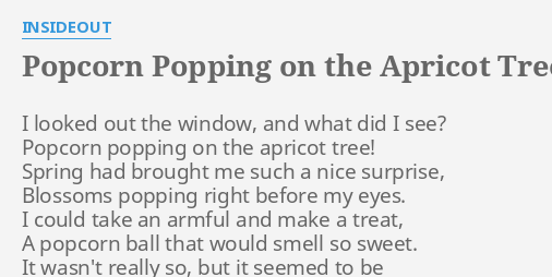 Popcorn, popping on the apricot tree. Spring has brought me such a nice surprise Popcorn popping right before my eyes I can take a handful and make a treat A popcorn ball that smells so sweet It wasn't really so, but it seemed to be ... View Full Source